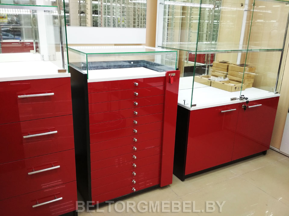 Магазин оптики, стойки для очков, мебель для оптикиМагазин оптики и медицинского оборудования на ул. Веры Хоружей в Минске. Мебель и оборудование изготовлены нашей компанией. В магазине размещено несколько видов оборудования: стеклянные витрины, пристенные зеркальные стойки для оправ, тумбы с множеством маленьких выдвижных ящиков, прилавок, шкафы-витрины с большими выдвижными ящиками.